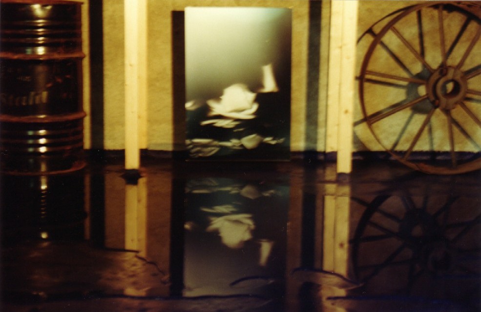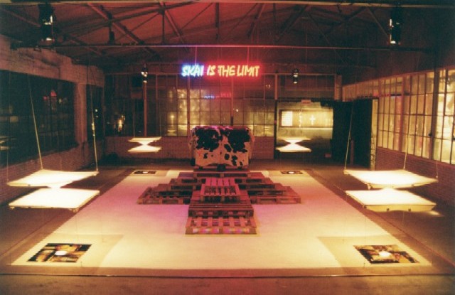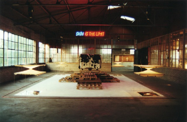 241 240De gelooide koeienhuid over een bok gehangen – staande op een stapeling pallets. Als een relikwie op een altaar in een industrieel architectonische ruimte (de stollerij). De zoutvlakte als metafoor voor de looiprocessen en zout gebruikt als beeldelement om de transparantheid van deze ruimte te versterken. Op de vier hoeken hangen transparante filters die gebruikt werden om grote hoeveelheden vervuild water te filteren. Onder de filters liggen historische opnames van lederwarenfabriek Rompa BV uit Rijen, die in december 1999 is afgebroken.