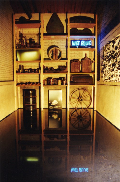 Deze verzameling (archief) van voorwerpen uit diverse leerfabrieken weerspiegelt zich als een stilleven in het water. Wet Blue is een term uit de leerindustrie; letterlijk vertaald betekent het nat blauw.