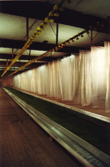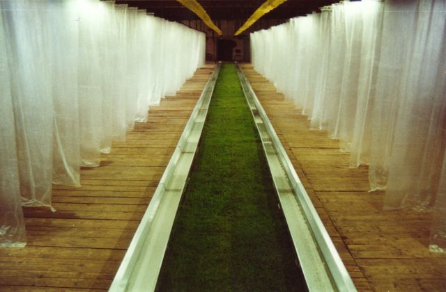 Door de luchtverplaatsing worden de stroken plastic gelijkmatig in beweging gebracht – binnen de gecreëerde installatie ontstaat een duidelijke associatie met de gang door de plastic sluizen van een slachthuis.