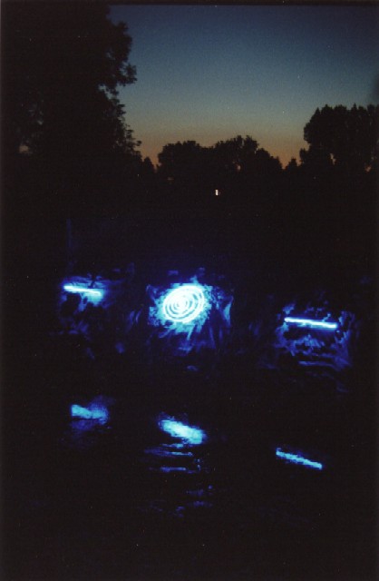 De neonsculpturen verwijzen naar de loop van de rivier.