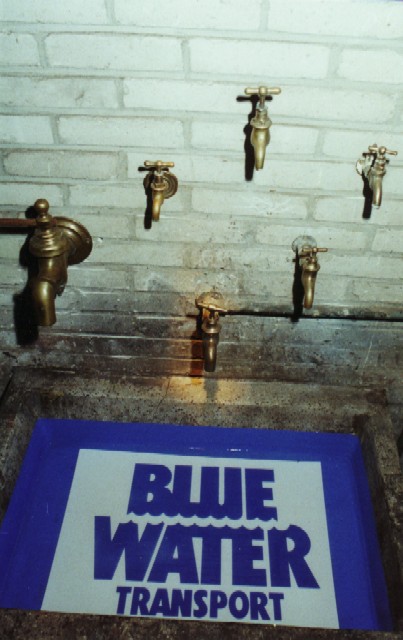 258 259In de wastafel ligt een foto onder water. De tekst op die foto is het logo van een bronwaterfabriek uit Denemarken. De glimmende koperen kranen weerspiegelend in het water vormen een contrast met de oude smerige wasbak waaronder een kapotte afvoer hangt.