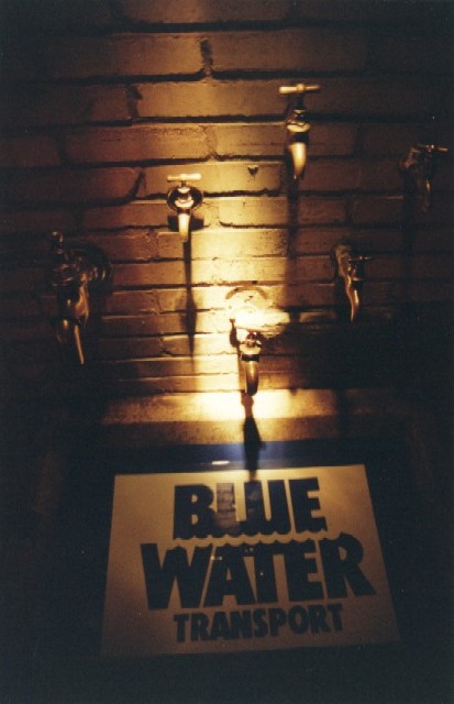 Wet Blue ligt hier opgestapeld in het rechter vak, staat afgebeeld op de foto die boven het Water hangt en is te lezen in de blauwe neonsculptuur.